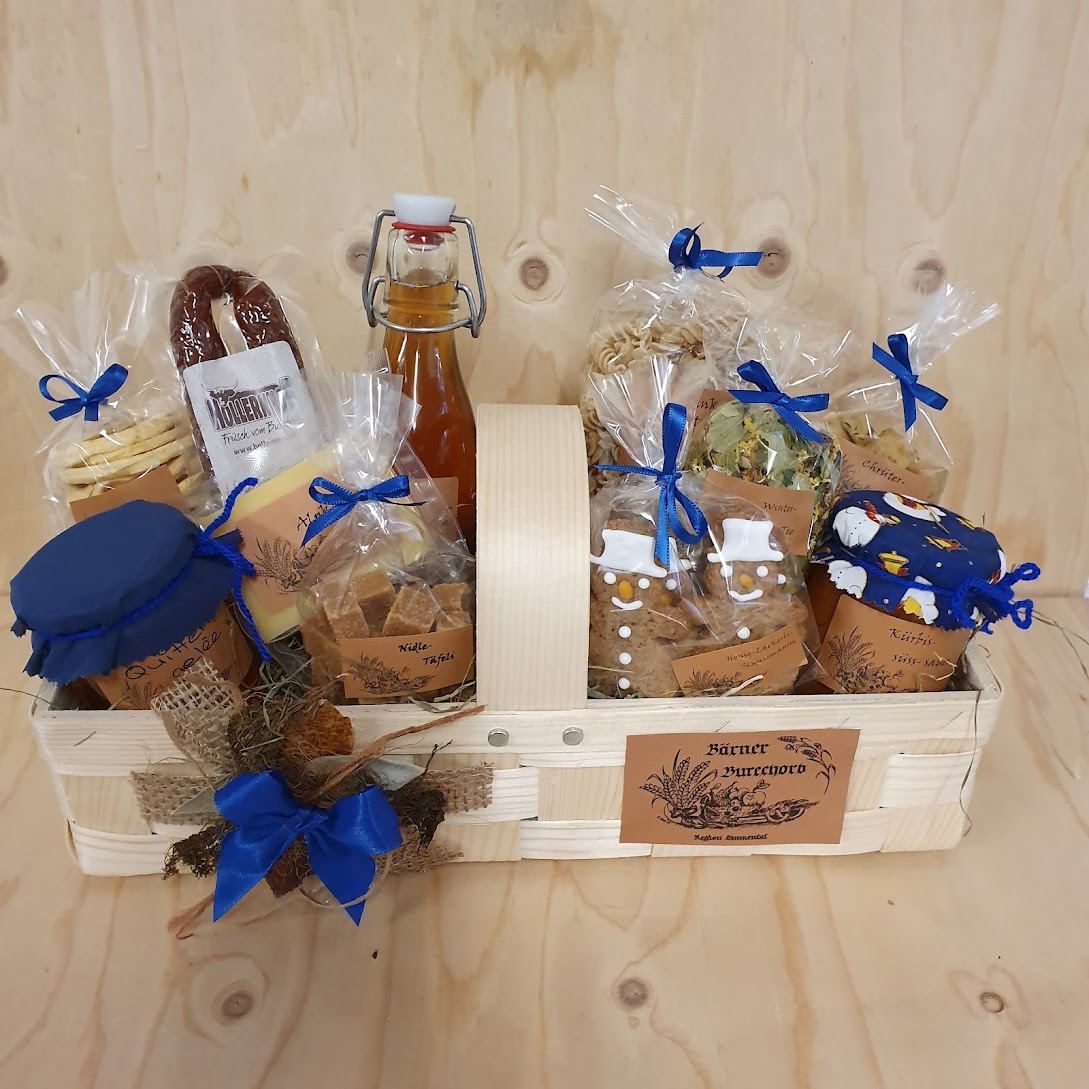 Wir bieten verschiedene Lebensmittel an, die in Geschenkkörben, Bettmümpfelischachteln, Eduwysstäschli oder Geschenkboxen schön arrangiert sind.