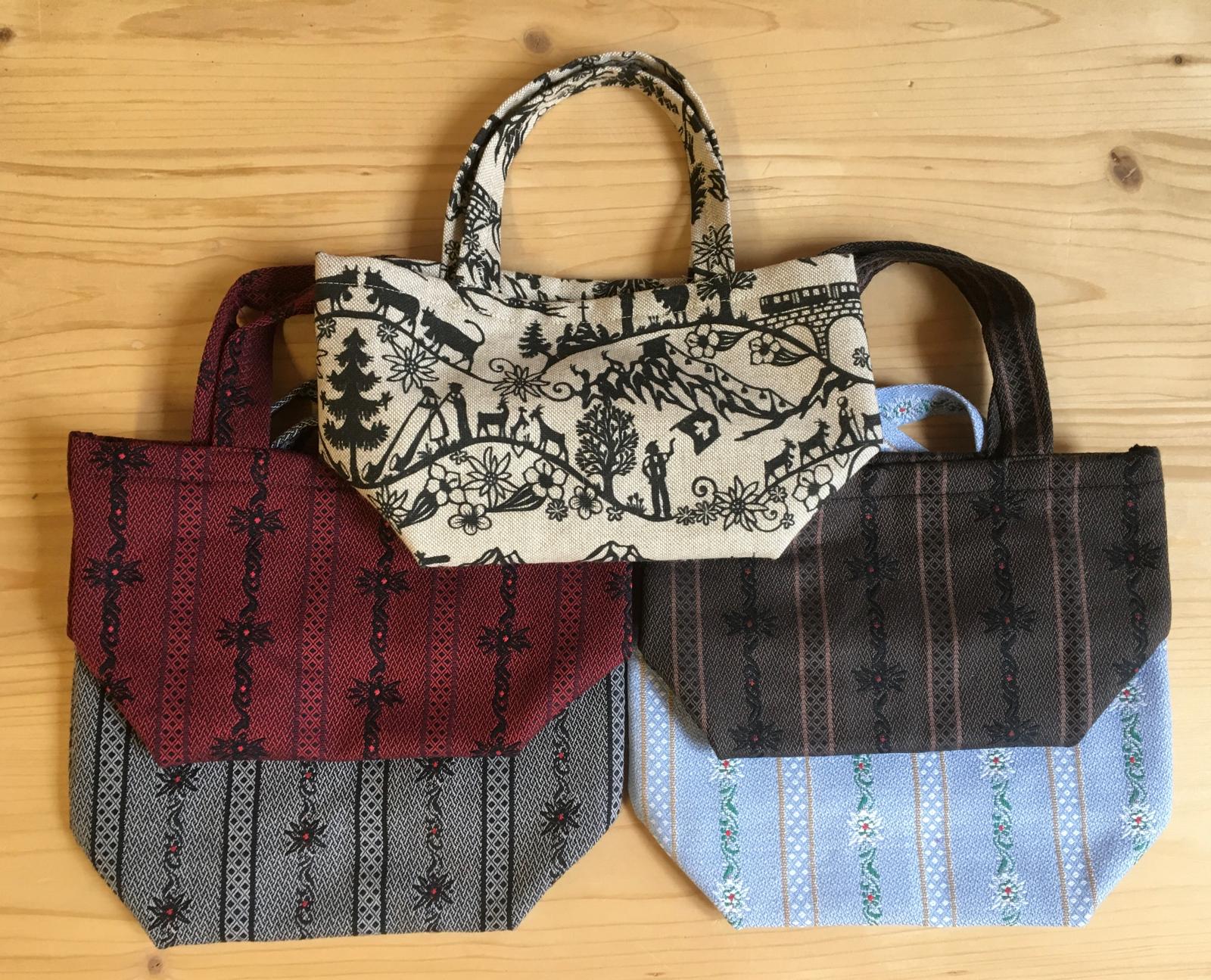 Die Täschli sind in vier Grössen und den 4 Farben rot, blau, grau und braun sowie in Scherenschnitt Stoff erhältlich.